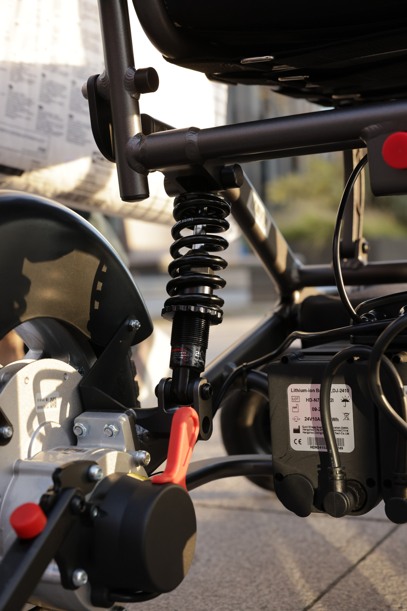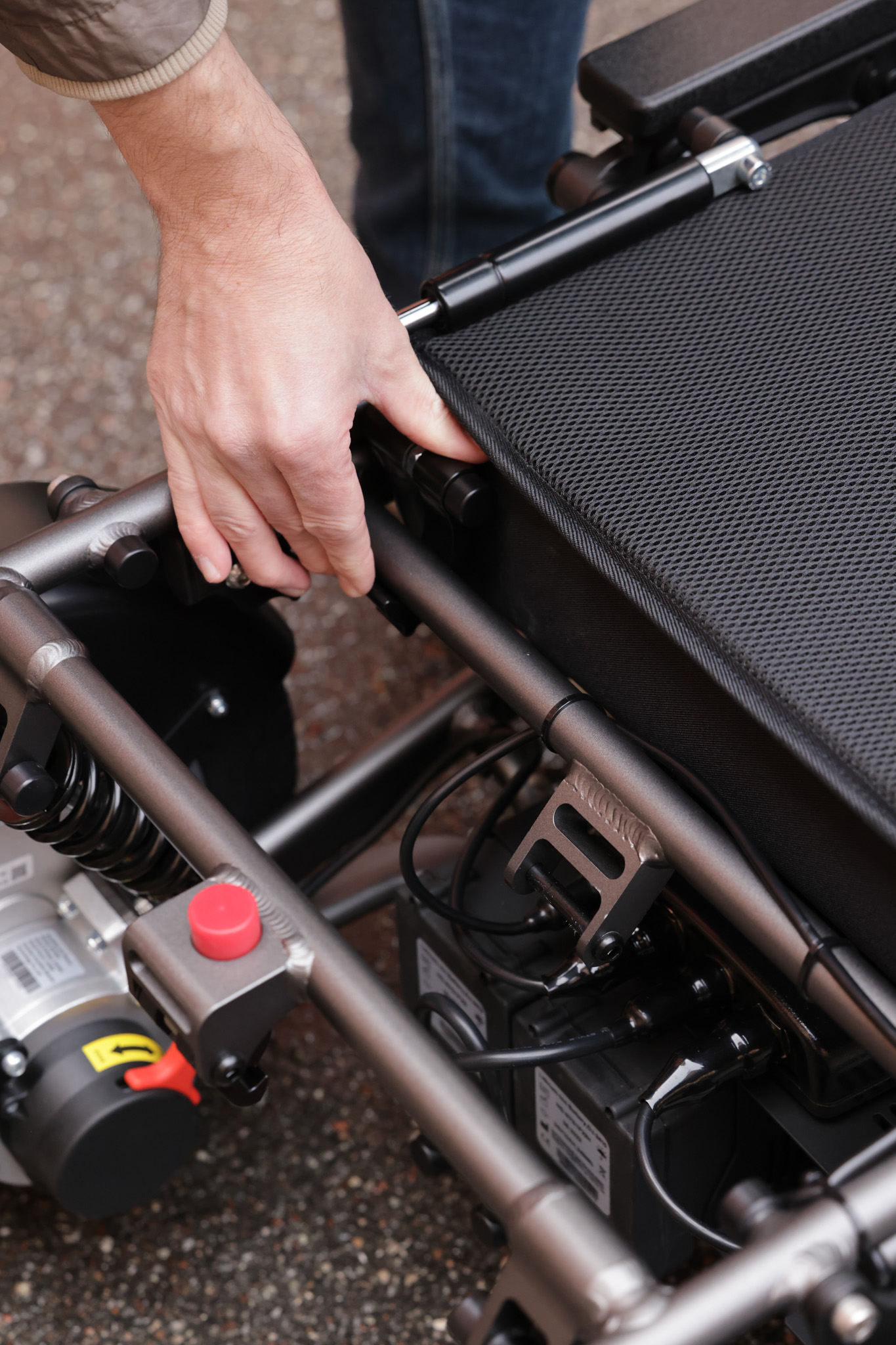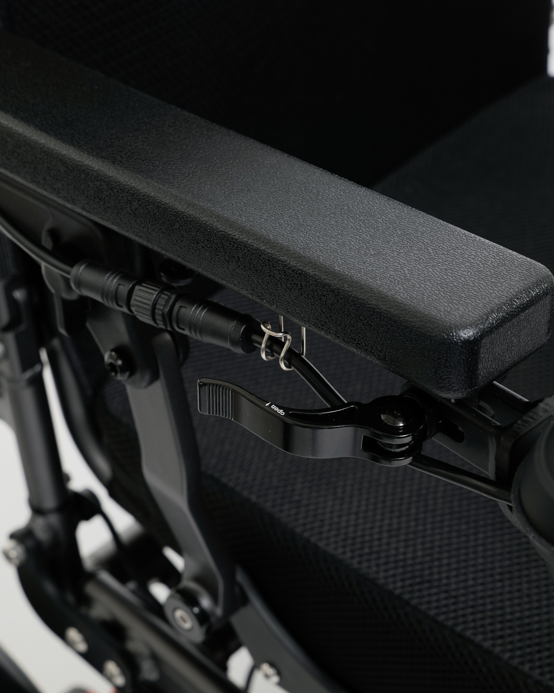 Die verstellbaren Armlehnen und die Fussstütze ermöglichen eine individuellere Passform und erhöhen den Komfort. Ausgestattet mit drei Batterie-Fächern bietet dieses Modell eine erweiterte Nutzung für längere Fahrten. Im zusammengeklappten Zustand hält ein Sicherheitsclip den Rollstuhl in kompakter Position für einfachen Transport und Lagerung.