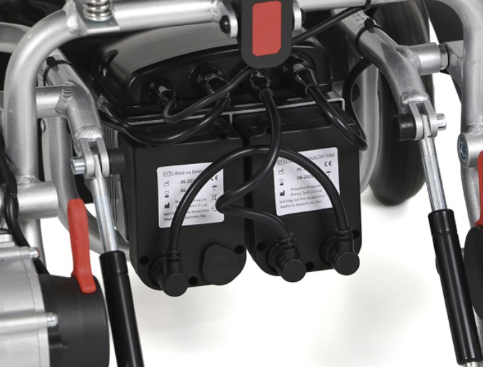 Der Eloflex wurde mit modernster Technologie entworfen, gebaut und hergestellt. Seine äußerst effizienten Lithium-Ionen-Akkus sind weitaus leistungsstärker als alte Bleibatterien, sowohl hinsichtlich der Performance als auch des Gewichts. Die leistungsstarken bürsten- und getriebelosen Direktantriebsmotoren sind direkt auf den Rädern montiert. Dadurch sind sie leiser und effizienter als die sperrigen Motoren von herkömmlichen elektrischen Rollstühlen. Im Gegensatz zu vielen anderen Marken wird Ihr Eloflex immer mit zwei Akkus geliefert.